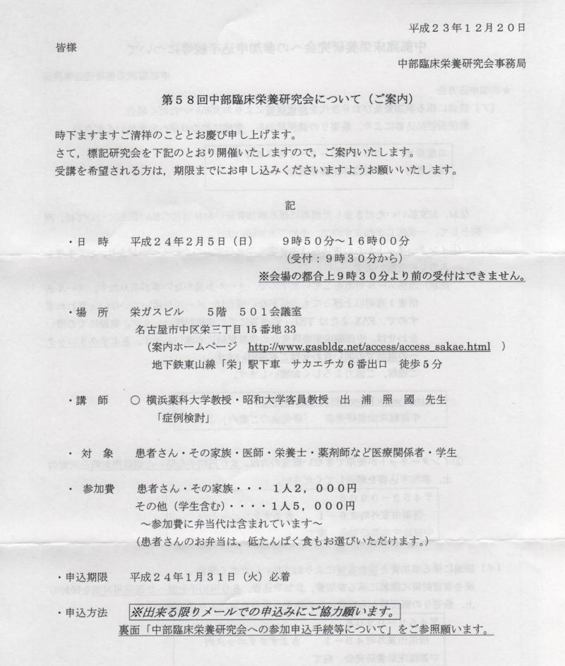 2月5日に 第58回 中部臨床栄養研究会が実施されるそうで お知らせが届いておりました。