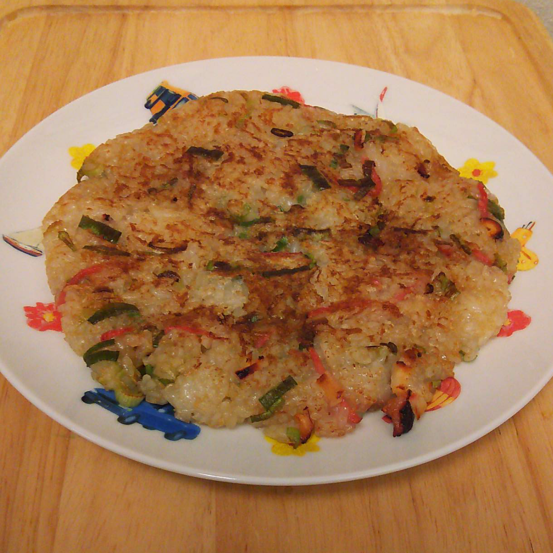 ボールに すりおろした長芋とだし汁・醤油・ねぎ・たこ・紅ショウガとパックご飯1パックを混ぜます。ごはんの玉がなくなるようにまぜまぜして フライパンで両面を焼きます。