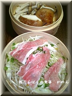 まずは 1段目にもやし・ねぎ・かいわれ・豚もも 2段目にキノコ類を入れて 10分程度蒸して見ました