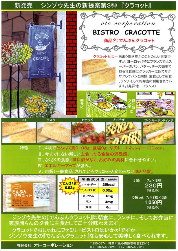 トーストにしたり オープンサンドにして食べる クラッカーとパンの中間なような「クラコット」が ジンゾウ先生から発売されているようです。