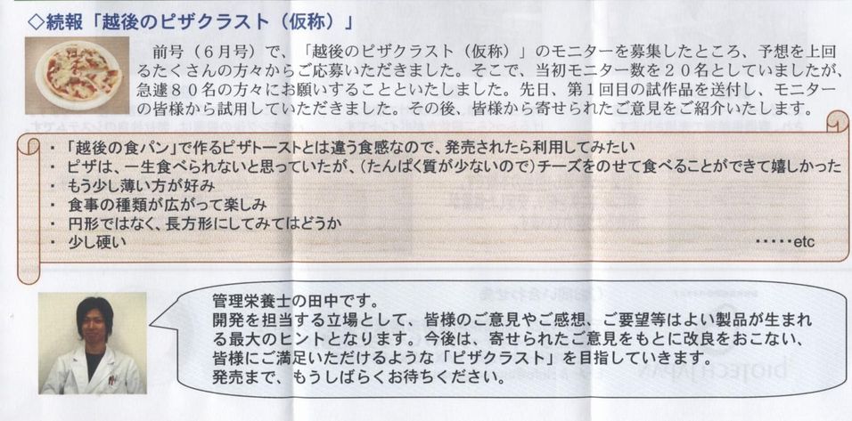 バイオテックジャパンさんのピザクラストのモニターをしたのですが その結果が掲載されておりました。