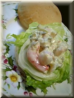 - えびはある程度大きめに切る。たまねぎは薄く輪切りにして水にさらす。レタスは適当な大きさに切る。