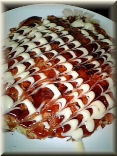 - フライパンを火にかけて 油を引いて <2>を両面焼き お皿にもりつけ ソースとマヨネーズをかける
