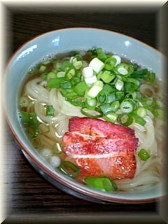 - フライパンでベーコンを焼いて焼き色がついたら お湯と調味料を入れスープを作り 1の器に入れ刻みねぎをのせる