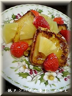 - パンの上面にグラニュー糖をまんべんなくふりかけて裏返し、こんがりと焼く。取り出して半分に切り、器に盛る。あればパイナップル イチゴをのせ、メープルシロップとオリゴ糖シロップをかけて食べる。