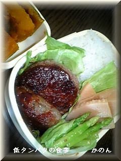 ハンバーグのソースは ハンバーグの片面だけにつけて アスパラガスは塩等は使わずニンニクととうがらしで炒めてニンニクは入れていません。かぼちゃは砂糖だけで炊いています。