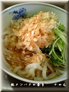 食べ方は うどんの上にさっと湯がいた水菜と鰹節をかけるだけ。水菜の歯ごたえがまだ残っている位で食べるのがお気に入り♪七味唐辛子をプラスするのがお勧め^^