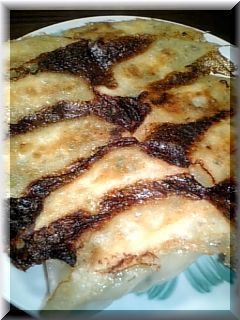 Kuropさんの所で何度か紹介があった餃子の皮を作ってみました。超ジャンボ餃子です。中まで火が通ってるか不安だったのでよ~~く焼いてみました。この写真のお皿はミート皿なんですよね^^;(これでも)