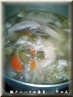 その手羽先を使って チキンスープストックを作ってみました。まだまだ試行錯誤中です。この前購入した「すうぷ屋のすうぷ」という本を参考にして 野菜を細かく刻んでみました。香りと野菜の甘みが強く出たように思います。本当はねぎの緑の部分だけの予定だったのに 全部入れてしまいました^-^; ご飯を炊いても香りが残ってよかったかも?。