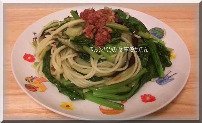 ナスと小松菜のコンビーフパスタ