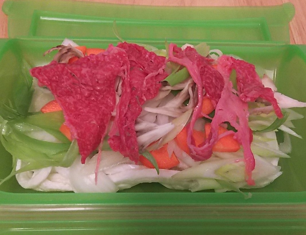 2)その上に野菜とお肉を乗せ タレを混ぜてかける。