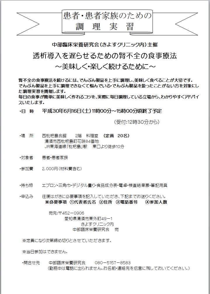 中部臨床栄養研究会主催にて 調理実習と市民公開講座が実施されます。