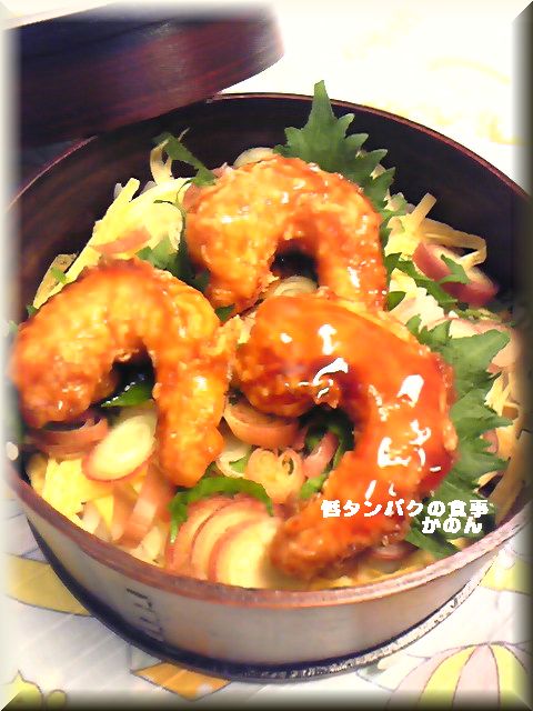 と いうのを数カ月前に知り 最近お気に入りの冷凍食品のえび天を使って ちらし弁当にしました。