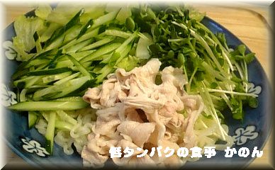 今日は ハムがなかったので 豚肉でしゃぶしゃぶにしました^-^ そしてトマトもなかったので 全体的に緑色の冷やし中華となりました(^_^;)