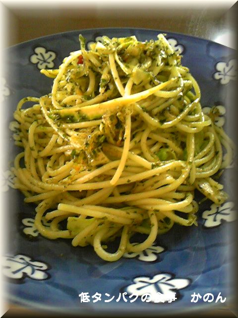 作りおきのジュノベーゼのソースと 湯通ししたしらすと ピューラーで細長くカットしたアスパラガスのパスタです。