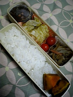 冷凍して作っておいたお弁当とごはんをセットにして今週のお昼です。 |